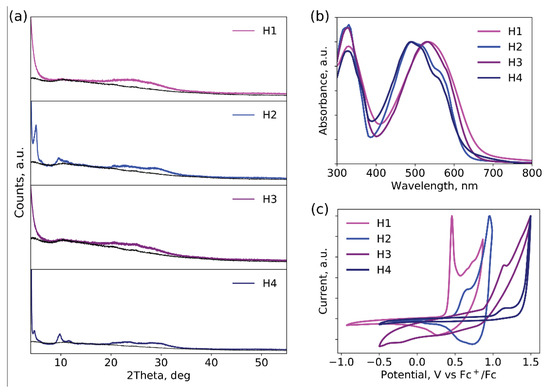 In order to obtain more insight into the crystallinity of materials H1-4 in thin films, X-ray diffraction patterns (XRD) were collected (Figure 3a and Figure S2). The XRD patterns of all materials exhibited sharp peaks in the small-angle region with d-spacings of >25Å, which indicates that the ordering of the molecules was in the liquid crystal phase [24]. The intense reflexes for the H2 and H4 samples at 2θ = 9.6–11.6° imply the superior crystallinity of films based on fluorine-containing compounds. This type of order may be attributed to the tilted organization of molecules in thin films [24,25]. The broad wide-angle peaks at 2θ = 24–30° are typical for the π-π stacking of conjugated molecules.