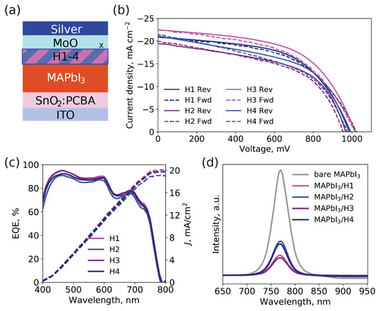 In the next step, materials H1-4 were investigated in PSCs with n-i-p configurations reported previously [28]. The detailed procedures of the devices’ fabrications are provided in the materials and methods section. Briefly, the glass with the conductive layer of indium-doped tin oxide (ITO) was used as an electron-collecting electrode and was covered with an ETM SnO2, which was further passivated with the acidic fullerene derivative, phenyl-C61-butyric acid [29]. The photo-active perovskite layer, MAPbI3, was deposited atop an inert atmosphere. Furthermore, the H1-4 HTMs were spin-coated from the solutions in chlorobenzene. Finally, the MoOx and silver electrodes were thermally evaporated under a vacuum, leading to the final ITO/SnO2:PCBA/MAPbI3/H1-4/MoOx/Ag architecture shown in Figure 4a.