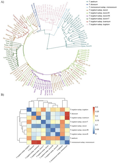 Phylogenetic and PCoA analyses were performed to estimate the overall relationship among varieties while considering the entire wheat germplasm investigated (126 genotypes) and the samples only belonging to T. turgidum subsp durum (84) collected. The distance-based dendrogram with Nei’s genetic distance [79], unweighted pair group method with arithmetic mean (UPGMA), neighbor-joining (NJ) algorithm (bootstraps based on 1000 resamplings), and PCoA were developed using R/poppr [80] and R/adegenet [81], respectively, and visualized using R/ggtree [82]. The Wright’s population pairwise fixation index (Fst) [83] was computed among species and groups using R/HierFstat [84]; a heatmap based on Fst values was developed using R/gplots (https://CRAN.R-project.org/package=gplot; accessed on 13 July 2022).