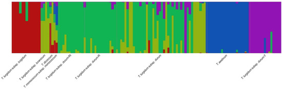 The multidimensional scaling (MDS) plots (Figure S6) illustrated distinct groups within the durum wheat class. This suggested that a portion of the genetic diversity from the accessions of durum-R and durum-RI groups had been introgressed in the remaining durum landraces/varieties. In contrast, the durum-T group accessions’ gene pool was shown to remain underutilized by breeding.