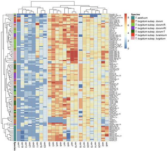 A principal component analysis (PCA) of the standardized data was applied to display the wheat morphological trait relationships and their application in germplasm characterization (Figure S3). The first two components explained only 29.1% of the total variation among the morphological traits investigated. However, the first dimension was able to clearly separate the samples belonging to T. turgidum subsp. turanicum (top-left quadrant) and T. aestivum (top-right quadrant), with var3, var5, and var 6 (Table S4) showing the strongest influence (cos2 = 0.60) (Figure S3). Likewise, almost the entire germplasm of T. turgidum subsp. turgidum studied (11 out of 14 samples; 79%) was included in the bottom-left quadrant. Of the traits, var7 and var10 were the most influential components (Figure S3). Overall, the flag leaf glaucosity of the sheath (var3), ear glaucosity (var6), and plant length (stem, ear, awns, and scurs; var10) were shown to strongly influence PC1 and PC2.