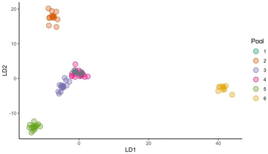 DAPC scatter plot of the 84 accessions belonging to T. turgidum subsp. durum (Table S1) based on the first and second linear discriminants (LDs) at the best K (6) as evaluated using the BIC method (Figure S5A). The membership for each sample is highlighted in Figure S5B.