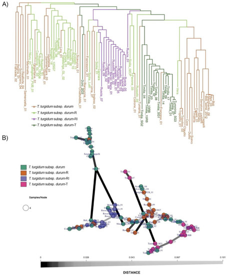 (A) NJ tree based on SNP profiles of varieties belonging to T. turgidum subsp. durum: T. turgidum subsp. durum, T. turgidum subsp. durum-R (‘Russello’), T. turgidum subsp. durum-RI (‘Russello Ibleo’), and T. turgidum subsp. durum-T (‘Timilia’). (B) A minimum spanning network (MSN) showing the multilocus genotypes (MLG) of accessions belonging to T. turgidum subsp. durum subset. The distances between the MLGs indicates Nei’s genetic distance; each MLG is a node and the genetic distance is represented by the edges. The nodes are connected by the minimum distance between samples, which allowed for reticulations. The grey scale of the edges is proportional to the genetic distance; the lines become darker for more-related nodes.