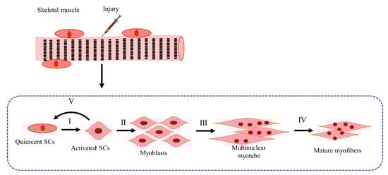 Upon injury, the regeneration capacity of the skeletal muscle is due to the SCs, and the critical steps such as SC activation and myoblast proliferation, differentiation, and fusion determine the extent of regeneration. Additionally, myotube maturation and the self-renewal of SCs also influence regeneration.