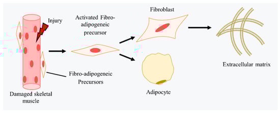 Fibrosis is an important stage for regeneration (Figure 3). In this process, the temporary extracellular matrix (ECM) components serve as a scaffold for new fibers and stabilize muscle tissue [89]. In damaged skeletal muscle, fibro/adipogenic progenitors (FAPs) are considered as the main source of fibroblasts [245]. After injury, FAPs are activated and begin to proliferate. This increases FAPs in the necrotic area, which need to be removed in time. Failure to clear FAPs will result in their differentiation into fibroblasts and adipocytes [246]. Fibroblasts secrete extracellular matrix proteins and growth factors and then differentiate into myofibroblasts to increase α-smooth muscle actin (α-SMA) expression and ECM synthesis, finally resulting in fibrosis [247]. Studies on the regulation of FAPs show that (Table 4) IL-4 secreted by infiltrated eosinophils stimulates the activation of FAPs in an IL-4-dependent way. IL-4/IL-13 signaling in FAPs contributes to proliferation and adipogenic differentiation of FAPs is inhibited to facilitate regeneration [55]. IL-1α and IL-1β inhibit the adipogenic differentiation of FAPs, and epidermal growth factor (EGF) and betacellulin (BTC) stimulate the proliferation of FAPs [248]. Lack of TGF-β1 in macrophages inhibits FAP proliferation and reduces fibrosis [249]. Inactivation of retinoic acid (RA) signaling in FAPs leads to adipogenic differentiation, which then impairs regeneration [246].