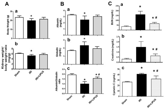 The effects of LIPUS on body weight, kidney weight, and serum biochemistry following unilateral IRI via contralateral nephrectomy on CKD mouse models (the mice were euthanized 14 days after IRI): (A) body weight (a) and kidney weight (b); (B) serum albumin levels (a), globulin levels (b), and albumin/globulin ratio (c); (C) serum blood urea nitrogen levels (BUN, (a)), creatinine levels (b), and cystatin C levels (c). Data are presented as mean ± SD (n = 8): * p < 0.05 versus the control group; # p < 0.05 versus the CKD-alone group.