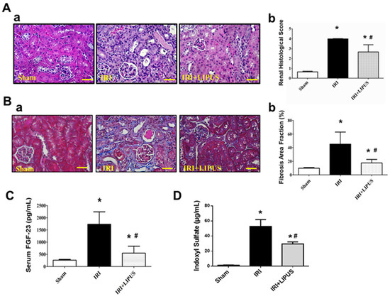 The effects of LIPUS on renal histology, renal fibrosis, and serum FGF-23 and indoxyl sulfate levels in IRI-CKD mice (the mice were euthanized 14 days after IRI): (A) (a) pathological changes in renal tissue sections stained with Periodic acid–Schiff (PAS), which were analyzed using a light microscope, and (b) histological score (scale bar: 50 μm); (B) (a) renal collagen deposition stained by Masson’s trichrome and (b) quantifications (scale bar: 50 μm); (C) serum FGF-23 levels; (D) serum indoxyl sulfate levels. Data are presented as mean ± SD (n = 8): * p < 0.05 versus the control group; # p < 0.05 versus the CKD-alone group.