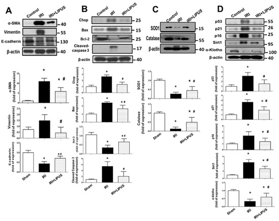 The effects of LIPUS on fibrosis-related signaling molecules, endogenous antioxidant enzymes, and senescence-related molecular signals in the kidneys of IRI-CKD mice (the mice were euthanized 14 days after IRI): the protein expression levels for fibrosis-related signaling molecules (α-SMA, E-cadherin, and vimentin) (A); the protein expression levels for apoptosis-related signaling molecules (CHOP, Bax, Bcl-2, and cleaved caspase 3) (B); the protein expression levels for antioxidant enzymes SOD1 and catalase (C); the protein expression levels for senescence-related molecules (p53, p21, p16, Sirt1, and α-Klotho) (D). These levels in the kidneys were determined by Western blot. Quantifications for the protein expression are also shown. Data are presented as mean ± SD (n = 4–6): * p < 0.05 versus the control group; # p < 0.05 versus the CKD-alone group.
