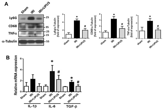The effects of LIPUS on inflammatory cell infiltration in the kidneys of IRI-CKD mice: Ly6G, CD68, and TNF-α protein expression levels in the kidneys, determined by Western blot (A); IL-1β, IL-6, and TGF-β mRNA expression levels in the kidneys, determined by real-time PCR (B). Data are presented as mean ± SD (n = 4–6): * p < 0.05 versus the control group; # p < 0.05 versus the IRI-CKD group.