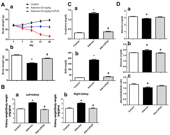 The effects of LIPUS on changes in body weight, relative kidney weight, and serum biochemistry in CKD mouse models following adenine administration (the mice were euthanized 28 days after adenine administration): (A) changes in body weight over time (a) and final body weight (b); (B) the relative weights of the left kidneys (a) and right kidneys (b); (C) serum blood urea nitrogen levels (BUN, (a)) and creatinine levels (b); (D) serum albumin levels (a), globulin levels (b), and albumin/globulin ratio (c). Data are presented as mean ± SD (n = 9): * p < 0.05 versus the control group; # p < 0.05 versus the CKD-alone group.