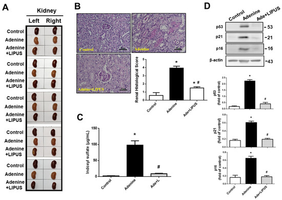 The effects of LIPUS on renal histology and serum indoxyl sulfate levels in CKD mouse models following adenine administration (the mice were euthanized 28 days after adenine administration): (A) the gross appearance of both the left and right kidneys; (B) pathological changes in renal tissue sections from the left kidneys stained with Periodic acid–Schiff (PAS), which were analyzed using a light microscope, and histological score (scale bar: 50 μm); (C) serum indoxyl sulfate levels; (D) senescence-related molecules (p53, p21, and p16) in the left kidneys, determined by Western blot. Quantifications for the protein expression are also shown. Data are presented as mean ± SD (n = 5–9): * p < 0.05 versus the control group; # p < 0.05 versus the CKD-alone group.