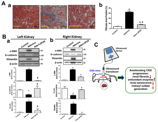 The effects of LIPUS on renal fibrosis and fibrosis-related signaling molecules in CKD mouse models following adenine administration: (A) (a) renal fibrosis stained by Masson’s trichrome in the left kidneys and (b) quantifications (scale bar: 50 μm; data are presented as mean ± SD (n = 10); * p < 0.05 versus the control group; # p < 0.05 versus the CKD-alone group); (B) protein expression levels for α-SMA, E-cadherin, and vimentin in both left (a) and right (b) kidneys of the adenine-induced CKD mice, determined by Western blot, and quantifications for the protein expression (data are presented as mean ± SD (n = 4–6); * p < 0.05 versus the control group; # p < 0.05 versus the CKD-alone group); (C) a schematic summary of our main findings regarding the effects of LIPUS on CKD-associated renal injury. Green upward arrows represent up-regulation. Red downward arrows represent down-regulation.