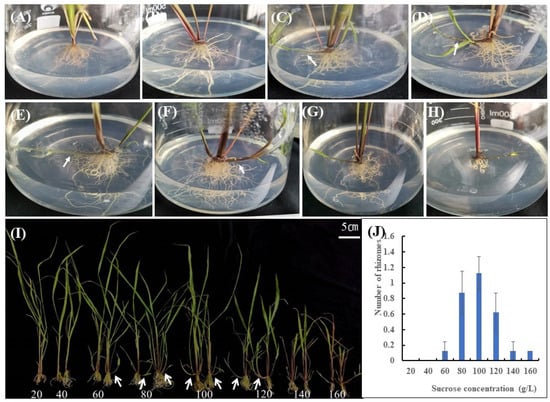 Effects of different sucrose concentrations on rhizomes of Oryza longistaminata. The corresponding sucrose concentrations in (A–H) are 20 g/L (A), 40 g/L (B), 60 g/L (C), 80 g/L (D), 100 g/L (E), 120 g/L (F), 140 g/L (G) and 160 g/L (H), respectively. Rhizomes are indicated with white arrows. (I) Phenotypes of the whole plants cultivated with various concentrations of sucrose. In (J), the abscissa represents different sucrose concentrations, and the ordinate represents the average number of rhizomes per plant under the corresponding sucrose concentration. The error bars represent standard deviation.