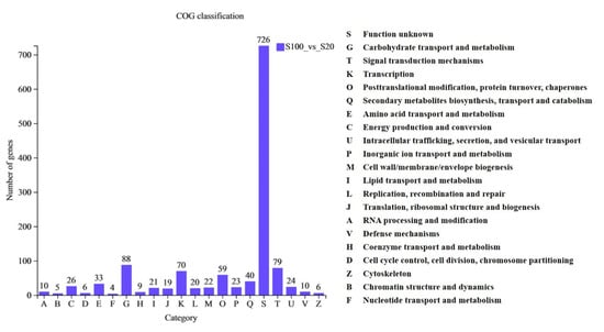 TPM (transcripts per million reads) was used as a quantitative index to analyze the quantitative results of gene expression. Based on the relative expression of genes, with |log2FC| ≥ 1 and P-adjust < 0.05 as the threshold, 1255 differentially expressed genes (DEGs) with significance were obtained between S20 and S100 groups (Table S5). Compared with the S20 group, 529 were up-regulated and 726 were down-regulated in the S100 group (Figure S2). DEGs were classified and analyzed by COG (cluster of orthologous groups of proteins), GO (gene ontology) and KEGG (Kyoto Encyclopedia of Genes and Genomes).