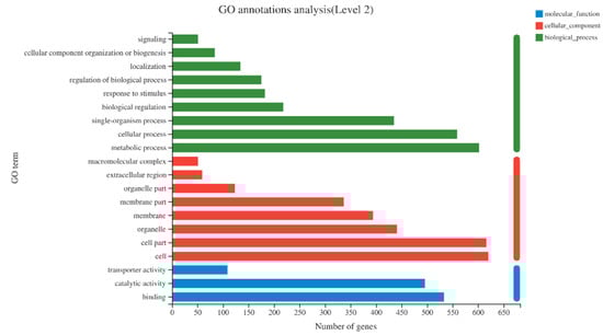 Histogram of GO classification statistics of differentially expressed genes. The vertical axis in the figure represents the secondary classification term of GO, and the horizontal axis represents the number of genes in the secondary classification.