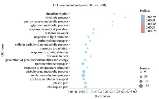 The DEGs were further analyzed for GO functional enrichment to obtain the main GO functions of the genes. When P-adjust < 0.05, this GO item was considered to be significantly enriched. It was found that a total of 125 GO items were significantly enriched, including circadian rhythm (GO:0007623), energy storage and metabolism (GO:0006112), carbohydrate transport and metabolism (GO:0008643, GO: 0044262, GO: 0005975), responses to water (GO: 0009414, GO: 0009415), etc. (Figure 5). Among them, there were 130 genes involved in carbohydrate transport and metabolism (Table S7). Many of these genes were the same as the genes in the G functional classification of COG, including vacuolar acid invertase gene Os02g0106100 (OsINV3) and xyloglucan endotransglucosylase hydrolase protein genes Os10g0545500, Os06g0697000 and Os10g0577500. There were also some other cell wall component-related genes, such as pectinesterase (Os11g0172100), polygalacturonase (Os01g0636500, Os05g0279900, Os05g0279850, Os05g0578750, Os05g0542900, Os01g0296200, Os05g0578600 (PSL1), Os01g0329300) and endoglucanase (Os09g0530250, Os08g0387400). In addition, there were some glycosyltransferase genes, sugar transporter genes, amylase genes, sucrose synthase genes and starch synthase genes among these 130 genes, such as Os03g0170900 (OsSUT1), Os07g0616800 (RSUS3; SUS3), Os07g0106200 (OsMST3), Os02g0513100 (OsSWEET15) and Os06g0160700 (OsSSI). There were 17 genes that responded to water (Table S8), mainly related to drought stress, such as catalase gene Os02g0115700 (OsCATA) [], aquaporin protein gene Os07g0448100 (OsPIP2;4), Os04g0521100, Os02g0823100 (OsPIP1;3), Os07g0448200, ABA-related genes Os05g0213500 (OsPYL/RCAR5; OsPYL5), Os11g0167800 (OsASR1), Os11g0454300 (RAB21; Rab16A) and transcription factor Os03g0741100 (OsbHLH148), which regulates drought tolerance in rice [].