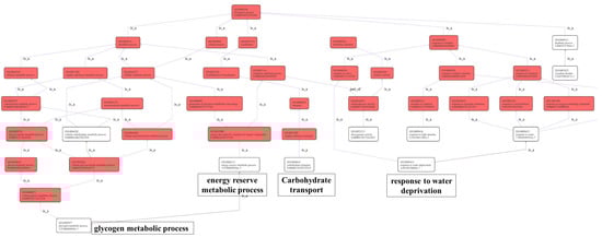 GO directed acyclic graph. The boxes show the GO IDs and annotations of the GO items. Red indicates the GO items with significant enrichment; the redder the color, the more significant the enrichment. The connecting line indicates the relationship between the two GOs. Please refer to http://geneontology.org/docs/ontology-relations/ (accessed on 25 September 2022) for the relationship explanation.