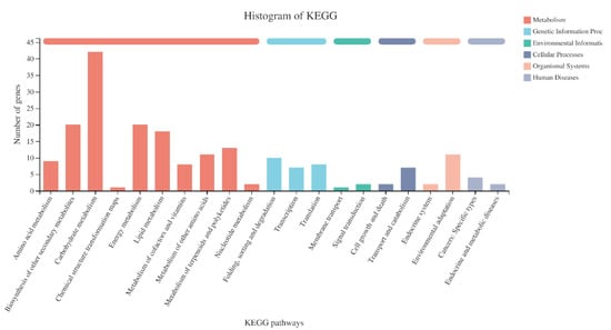 Classification statistics of differentially expressed genes in the KEGG pathway. The abscissa is the name of the KEGG metabolic pathway; the ordinate is the number of genes annotated to this pathway.