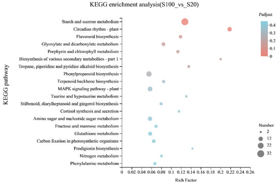 Among the differentially expressed genes, 14 genes were selected for qPCR. The expression level of both the qPCR and the RNA-Seq results of the control group S20 were assigned as 1, and the relative expression level of the treatment group S100 was calculated. The results showed that the up- and down-regulation of gene expression detected by qPCR was consistent with the results of RNA-Seq (Figure S3).