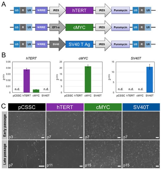 Generation of immortalized CSSC lines. (A) Schematic representation of lentiviral constructs for hTERT, c-MYC, and SV40T immortalizing methods. (B) Levels of transcript of the immortalization genes (hTERT (p7), c-MYC (p15), and SV40T (p15)) in each cell line, measured by RT-PCR. Results were expressed as mean ± SD. Statistical analysis: ANOVA comparison of the means, followed by all-pair comparisons Tukey’s test. CSSC: corneal stromal stem cells, pCSSC: primary CSSC; n.d.: not detected; p: passage number. (C) Phase-contrast images of pCSSC (p3 and p7), hTERT-imCSSC (p7 and p11), c-MYC-imCSSC (p7 and p15), and SV40T-imCSSC (p7 and p15) cells at early and late passages. Scale bar: 100 μm. CSSC: corneal stromal stem cell; pCSSC: primary CSSC; imCSSC: immortalized CSSC; p: passage number; SD: standard deviation.