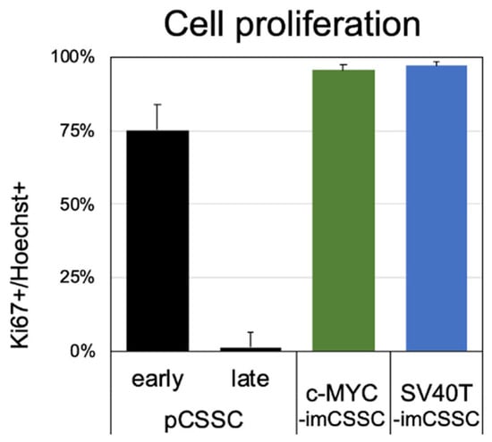 Parental pCSSC had a morphology typical of MSCs: a small, spindle-shaped cell body with short processes (passage 3, Figure 1C). A similar morphology was observed in c-MYC-imCSSC, SV40T-imCSSC, and hTERT-imCSSC cells at early passages following immortalization (passage 7, Figure 1C). At later passages, pCSSC transitioned to a fibroblast-like phenotype, with larger cell bodies and elongated cellular processes (passage 7, Figure 1C), whereas c-MYC-imCSSC and SV40T-imCSSC both maintained their morphology for over 15 passages (both p15; Figure 1C). Furthermore, c-MYC-imCSSC and SV40T-imCSSC overexpression was successful in bypassing replicative cell cycle arrest of pCSSC, as most of the cells (96% and 97%, respectively) were actively proliferating at passage 10 compared to 1% in pCSSC at passage 7 as detected by Ki67 expression (Figure 2). Although hTERT-imCSSC propagated for an additional six passages, there was a shift in their phenotype to a large and flat morphology (Figure 1C) accompanied by a reduced proliferation, which indicated cellular senescence. The overexpression of hTERT failed to overcome cellular senescence beyond passage 12 and this immortalization approach was deemed unsuccessful. The rest of the experiments were conducted comparing c-MYC-imCSSC and SV40T-imCSSC with respect to pCSSC.