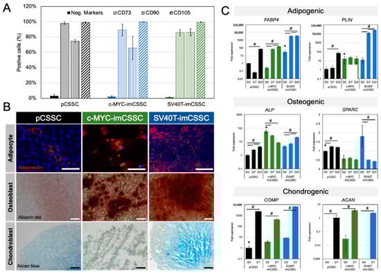 To further characterize the imCSSC, we investigated their multilineage differentiation capacity in vitro towards adipogenic, osteogenic, and chondrogenic fates []. Following adipogenic lineage induction, lipid droplets and adiponectin protein expression were detected in all imCSSC and pCSSC (red, Figure 3B). This observation was further confirmed by an increased mRNA expression of adipogenic markers: fatty acid binding protein 4 (FABP4) and perilipin (PLIN) after 7 and 21 days of induction (Figure 3C, top panel) []. Higher basal expression levels of FABP4 and PLIN were observed in undifferentiated SV40T-imCSSC and c-MYC-imCSSC as compared to that of pCSSC (p-value < 0.05, Figure 3C, top panel).