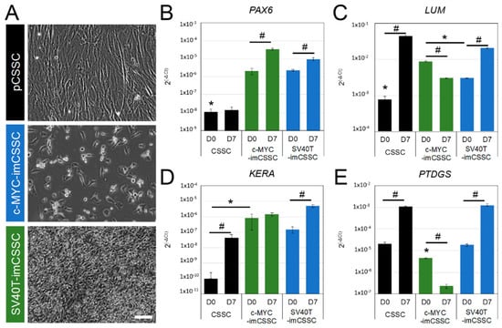 We next investigated the impact of immortalization on the differentiation ability into keratocytes. After 7 days of keratocyte lineage induction with TGF-ß3 and FGF2 [,,], the morphology and organization of the investigated cells demonstrated distinctive morphologic features (Figure 4A). Moreover, pCSSC were organized in a monolayer with long extended cellular processes, a characteristic of quiescent keratocytes (Figure 4A) []. Following the 7-day induction, SV40T-imCSSC were arranged in multiple layers of small cells. In contrast, c-MYC-imCSSC did not sustain confluency and maintained a small, round cell body similar to their undifferentiated cells (Figure 4A). The transcript levels of the keratocyte markers lumican (LUM), keratocan (KERA) [,], and prostaglandin D2 synthase (PTGDS) [] were all upregulated in pCSSC and SV40T-imCSSC in each cell line after 7 days of induction, as compared to their undifferentiated state (D0) (p < 0.05, Figure 4C–E). Contrastingly, c-MYC-imCSSC upregulated the corneal progenitor marker PAX6 at day 7 of differentiation (p-value = 0.0002, Figure 4B), but not LUM, KERA, nor PTGDS []. Taken together, keratocyte lineage commitment was observed to a greater extent in SV40T-imCSSC.
