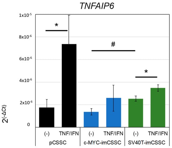 The anti-inflammatory effect of CSSCs, as measured by the secretion of TSG-6 upon stimulation in culture, correlates with their anti-inflammatory potential in an in vivo mouse model of corneal wounding [,,]. The transduction, integration, and overexpression of c-MYC and SV40T genes may affect the functional properties of CSSCs. Therefore, we investigated the expression of TNFAIP6 in pCSSC, SV40T-, and c-MYC-imCSSC after stimulation with pro-inflammatory cytokines IFN-γ and TNF-α. TNFAIP6 was detected in all cell lines investigated. The basal levels in unstimulated c-MYC- and SV40T-imCSSC were similar to those in pCSSC (Figure 5). After stimulation with IFN-γ and TNF-α, TNFAIP6 levels were significantly upregulated in pCSSC and SV40T-imCSSC with a 4.2- and 1.4-fold increase, respectively, as compared to their basal levels (all p values < 0.05). Although not significant, pro-inflammatory cytokines-treated c-MYC-imCSSC upregulated TNFAIP6 with 1.8-fold (p-value = 0.101, Figure 5). Our results suggested that SV40T retained anti-inflammatory properties, although to a lesser extent than pCSSC did.