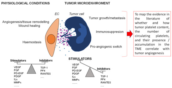 The crosstalk of platelets with TME components in tumor progression is a milestone in cancer research [1,2,3,37]. The present review aims to provide a comprehensive overview about the role of platelets in cancer progression, mediated by the modulation of tumor angiogenesis. The contribution of TME components in the processes of tumor progression has received much attention in recent years. Among the components of the microenvironment, platelets, because of their rich content of growth factors and cytokines, have also been of interest both in their relationship with tumor cells and with TME cells, including the endothelium. The evidence that platelets are rich in angiogenic factors and thus might play an important role in orchestrating tumor angiogenesis is from the last century. This scoping review brought together the work of the past 20 years on the topic of correlation between platelets and tumor angiogenesis to analyze what and how much evidence had been gathered. Interestingly, we found little evidence showing that platelets do not contribute to tumor angiogenesis process [80,81,91,92]. We think it unlikely that this is related to our search strategy (two large literature databases and an extensive search) but perhaps to publication bias. Therefore, we recommend that further researchers who intend to perform a systematic review on this topic also look for available evidence in the gray literature.