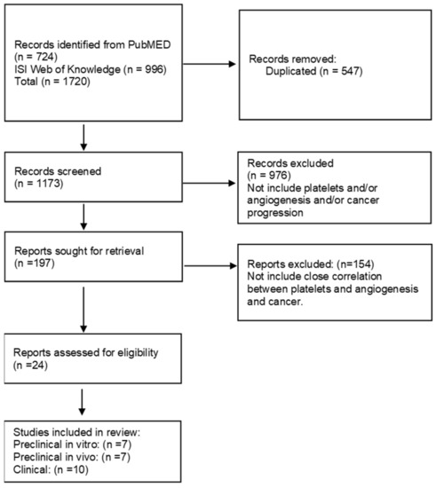 A total of 1173 studies were retrieved from PubMed and ISI Web of Science (Figure 2). The screening of titles and abstracts allowed the selection of 197 potentially eligible studies. Among them, a total of 24 studies fulfilled the eligibility criteria and were included in the review. No further studies were retrieved through a snowballing search. Overall, we found seven preclinical studies on cells [69,70,71,72,73,74,75], seven preclinical studies on in vivo tumor models [54,76,77,78,79,80,81], and ten clinical studies [71,75,82,83,84,85,86,87,88,89,90]. Two articles presented both preclinical and clinical evidence on platelets and tumor angiogenesis and were analyzed in both the results dedicated to preclinical and clinical evidence [71,75].