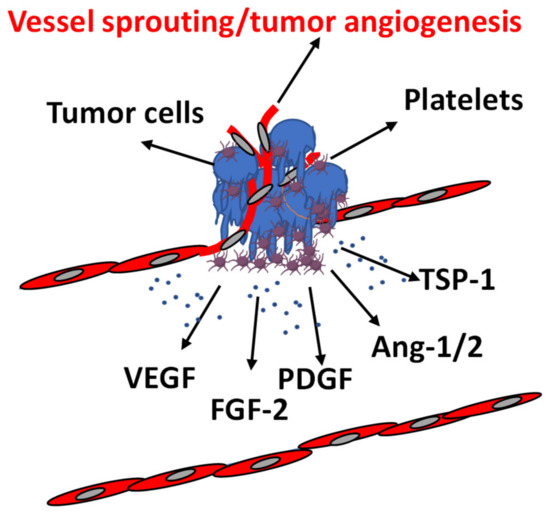 In TME, platelets release circulating angiogenesis-related factors, including VEGF, platelet-derived growth factor (PDGF), FGF, and metalloproteinases (MMPs); in addition, they promote the expression of proangiogenic factors by tumor cells [32]. Platelet alpha (α) and dense (δ) granules contain one of the largest stores of angiogenic and mitogenic factors (VEGF, PDGF, FGF-2, MMPs), antiangiogenic factors (endostatin, thrombospondin-1, plasminogen activator inhibitor-1, and angiostatin), chemokines (platelet factor 4, PF4, RANTES), and cytokines (IL-1β), which markedly affect vascular biology [33,34,35,36]. On the other hand, leaky tumor vasculature allows platelets to directly meet the tumor, and tumor cells activate platelets, leading to platelet aggregation and the release of platelet-derived growth and proangiogenic factors, which in turn, in a vicious circle, support tumor growth and angiogenesis [35,37,38].