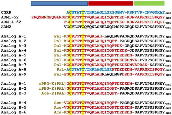 Alignment of ADM family peptides and chimeric analogs. The alignment includes wild-type peptides and Analogs A-1 to A9 and Analogs B-1 to B-6. In chimeric analog sequences, residues derived from CGRP, ADM, and ADM2 are indicated by blue, red, and black letters, respectively. The disulfide ring-forming cysteines are indicated by a yellow background. The N-terminal modifications, including lysine-conjugated palmitoylation (Pal-K or K(pal)) and mini-PEGylation (abbreviated as mPEG), are indicated by brown letters. Dash lines are added in select sequences to improve alignment. Acetylation is abbreviated as Ace. The putative activation, binding, and junctional regions of these peptides are indicated by blue, green, and red horizontal bars above the alignment, respectively.