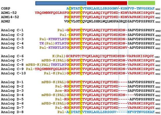 Alignment of analogs with an N-terminal sequence modification or a truncation at the junctional region. The alignment includes CGRP (blue letters), adrenomedullin (red letters), and adrenomedullin 2 (black letters) as well as Analogs C-1 to C-9 and Analogs D-1 to D-8. Cysteine residues that form a disulfide ring are indicated by a yellow background. A putative collagen-binding motif is indicated by purple letters. The origin of individual residues in chimeric analogs is indicated by text colors. The N-terminal modifications, including lysine-conjugated palmitoylation (Pal-K or K(pal)) and mini-PEGylation (abbreviated as mPEG), are indicated by brown letters. Sequence gaps are indicated by dash lines. The putative activation, binding, and junctional regions of these analogs are indicated by blue, green, and red horizontal bars above the alignment, respectively. The motif corresponding to the hinge region of CGRP is indicated by a blue rectangle box.