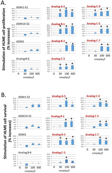 Because ADM-CLR/RAMP2 signaling is a key regulator of endothelial and lymphendothelial functions, analogs with enhanced CLR/RAMP2-activation activity could have improved bioactivity toward basic functions of vascular endothelial cells. As such, we studied the effect of select analogs, which have an enhanced CLR/RAMP2-activation activity (i.e., Analogs A-5, B-1, B-3, C-3, C-4, C-5, and C-7), on the proliferation and survival of primary human lymphatic microvascular endothelial (HLME) cells in vitro. Consistent with the hypothesis, these analogs dose-dependently stimulated HLME cell proliferation and survival at the 30–100 nmoles/L range (Figure 3A,B). On the other hand, wild-type ADM (ADM1-52 and ADM14-52), ADM2, and a nonpalmitoylated chimeric peptide (Analog B-6) had minimal effects on HLME cell proliferation and survival at the same doses. In addition, select analogs such as Analogs A-5, C-3, C-4, and C-7 appeared to have a greater stimulatory effect on proliferation and/or survival at the 100 nmoles/L level when compared to the 300 nmoles/L group. These data may indicate that a high pharmacological dose of these analogs may have a deleterious effect on cell metabolism and cell cycle progression or lead to the down-regulation of CLR/RAMP receptors.