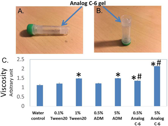 Visual analysis showed that Analog C-6 solution exhibits gel-like characteristics at the 6–20% level within 20–30 min, and this transformation limited the mobility of the analog solution (Figure 4A,B). After gel formation, the solution lost the free-moving aqueous fluid characteristics. Consistent with the visual analysis, studies of the viscosity using a viscometer showed that the viscosities of a 1% Tween 20 solution, 5% ADM solution, 0.5% Analog C-6 solution, and 5% Analog C-6 solution are significantly higher than that of water. Although the viscosity of wild-type ADM and Analog C-6 solutions increased in a dose-dependent manner, the viscosity of Analog C-6 solution was significantly higher than that of wild-type ADM at the same concentration (Figure 4C). These data suggest that the Analog C-6 has a high propensity to form gels.