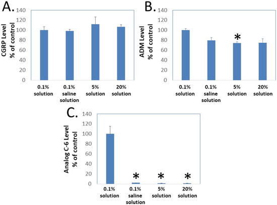 To determine whether gel formation restrains the movement of Analog C-6 molecules, we studied the ability of CGRP, wild-type ADM, and Analog C-6 molecules to pass through the Centricon filter at different concentrations. In this analysis, aliquots of peptides were first dissolved at target concentrations (i.e., 0.1%, 5%, and 20%), and the high-concentration samples were then diluted to the 0.1% level 10 min later before the centrifugation separation step. Analysis of peptide levels in the elutes of Centricon columns showed that the levels of CGRP in elutes from the 0.1% solution in saline, and the 0.1%, 5%, and 20% solution in 5% glucose are similar (Figure 5A). Although the levels of ADM in the elute from the 0.1% solution in saline and the 0.1% solution in 5% glucose are similar, the level of ADM in the elute from the 5% and 20% solution groups was lower than that of the 0.1% solution group and the difference was significant between the 0.1% and 5% solution groups (Figure 5B). By contrast, the Analog C-6 appeared to have a low solubility in the saline solution and formed liquid gel at 5% and 20% levels. Only a trace amount of Analog C-6 monomer went through the membrane, and the level of Analog C-6 in the elute from the 0.1% solution was 30–50 folds higher than those from the 0.1% in saline, 5% solution, and 20% solution groups (Figure 5C). These data suggested that most Analog C-6 molecules in 5% and 20% solutions were sequestered in the gel and cannot pass through the Centricon filter membrane.