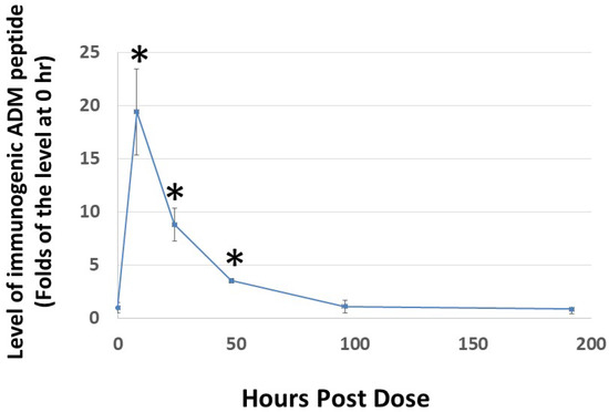 Because the rate of dissociation of hydrogels depends on electrostatic interactions among the monomeric peptide, solvent, and solutes, the release of Analog C-6 from the gel solution is likely affected by various environmental factors [47,48,49]. Therefore, it is important to characterize the release kinetics of the analog gel in vivo before we can reasonably design studies to investigate its efficacy in animals. Analysis of the level of Analog C-6 in rats after subcutaneous injection of a 16% gel solution showed that the level of Analog C-6 peaks at 8 h after injection, and the peptide level remained significantly elevated at 2 days after administration (Figure 6). These data suggested that the self-assembled gel formulation allows the Analog C6 peptide to be slowly released in vivo given that wild-type ADM is known to have a short half-life of 20–30 min.