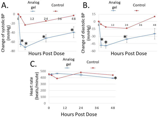 The Analog C-6 gel solution has a prolonged effect on blood pressure in SHR rats. Subcutaneous injection of Analog C-6 gel solution led to the significant reduction of (A) systolic blood pressure at 2, 6, 24, and 48 h after administration and (B) diastolic blood pressure at 2, 6, and 24 h after administration in male SHR rats (8%; 8 mg/100 µL injection). On the other hand, Analog C-6 gel injection only affected (C) the heart rate 48 h after injection. The hemodynamics was recorded on 0, 2, 6, 24, and 48 h after drug administration. Data are mean ± SEM of five separate animals. In addition, the change of hemodynamics of a representative control animal, which received saline injection, is included for comparison (red lines) *, Significantly different from the measurement at 0 h.