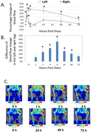 After acclimation, adult male Sprague–Dawley rats were anesthetized and stabilized under 2.5% isoflurane, and placed on a heating pad. The amount of blood flow of the hindlimbs was determined by laser Doppler imaging as described earlier [156]. The laser Doppler scan series began with two baseline scans and were followed by two scans each at select time points. Data are reported as percent change from the average baseline scans.