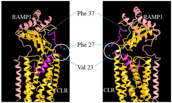 Illustration of the putative position of the hinge region in CGRP/ADM family peptides and analogs. The interaction of ADM analogs and CLR/RAMP receptors could be analogous to that between CGRP and CLR/RAMP1 (RCSB protein data bank [PDB] structure 6E3Y). The structure view of CGRP-CLR/RAMP1 complex 6E3Y is depicted from two different angles, and it includes CGRP (red), RAMP1 (pink), and CLR (yellow) components. The unresolved structure at the hinge region is indicated by a white circle. Residues Val23 and Phe27, which are neighboring residues of the hinge region (Lys24-Asn26), and the C-terminal Phe37 of CGRP are indicated by arrows.