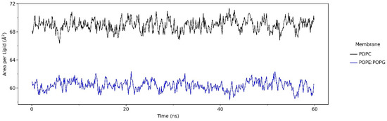 Preliminary analysis as an assessment of the peptide–membrane systems was conducted via area per lipid calculation (Figure 1). It showed that both systems have similar values to the average area per lipid for the POPC and POPE:POPG lipid bilayers in other studies [17,23]. Thus, it can be said that the peptide–membrane systems in our simulation were confirmed to be rational.