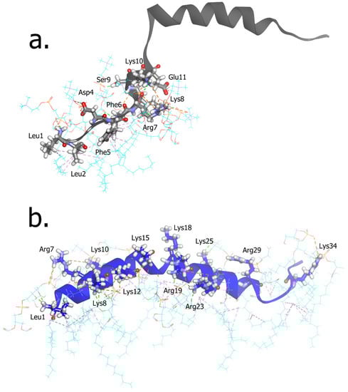 This study also revealed the residues that play an essential role in the interaction of the LL-37–POPE:POPG membrane, which mainly consist of Lys and Arg, whereas amino acids with specific properties, such as basic (arginine or lysine) or hydrophobic amino acids (phenylalanine or tryptophan, leucine, and alanine), are usually used. Specifically, Lys18, Arg23, Lys25, and Arg29 in the core region suggested that the antimicrobial activity of AMPs also depends on the constituents of positively charged amino acids (Figure 4). Furthermore, a similar finding was experimentally proven by alanine scanning, where positively charged residues between positions 18 and 29 were changed to alanine, resulting in a substantial decrease in antimicrobial activity [31,32].