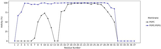 The helicity percentage (%) was used to monitor the conformational changes of LL-37 during interaction with the POPC and POPE:POPG membranes. LL-37 retains its helical conformation while attached to the POPE:POPG membrane surface. However, in the POPC membrane system, the first 16 residues of LL-37 have low helicity (%), caused by its mobility to find the most stable conformation to interact with the membrane surface (Figure 5).