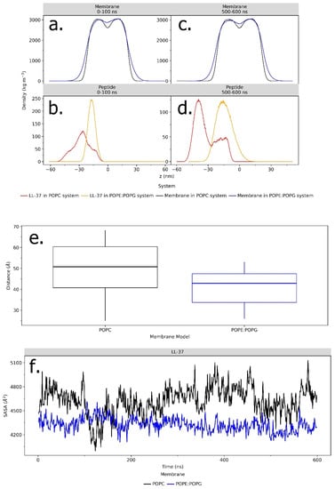 Electron density profiles of LL-37 with the POPC (black) and POPE:POPG (blue) membranes at the initial position and after 600 ns of simulation (a–d). The average distance (Å) between LL-37 and the center of the POPG and POPC bilayer membranes calculated using cpptraj program in Amber20 (e). The SASA (Å2) fluctuation of LL-37 in POPC and POPE:POPG membrane systems during the 600 ns simulation (f). The data were calculated using NAMD analysis from VMD.