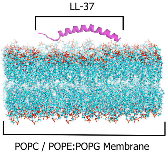 Antimicrobial peptide LL-37 was simulated in the presence of bacterial cell membrane mimics, which were POPE:POPG (2:1) membranes. In terms of structure, LL-37 is a linear peptide that is rich in basic residues (5 Arg, 6 Lys), resulting in a +6 net charge at physiological pH. Because approximately 35% of the residues are hydrophobic, it adopts an amphipathic helical shape with a small but well-defined hydrophobic sector. All of these properties are required for oligomerization in aqueous salt solutions, as well as peptide–membrane interactions [14], because their cationic and amphipathic characteristics mimic the antimicrobial peptides that prokaryotes excrete to kill other bacteria [27].