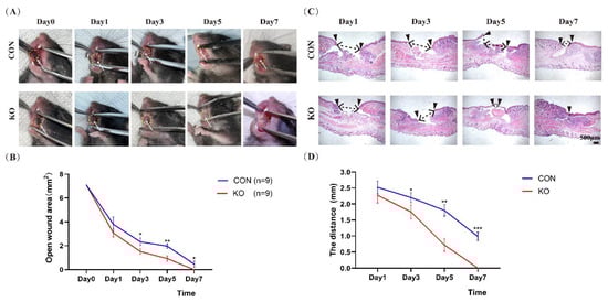 Oral wound healing is accelerated in Med1epi−/− mice. (A) Representative macroscopic views of oral wounds on days 1, 3, 5, and 7 after injury in control and MED1 null mice. The yellow dotted circles indicate the initial position of the wound. Trauma locations are indicated with white arrows, (B) Evaluation of open wound area by morphometrical analysis of the wound areas. n = number of measurements, (C) Representative histological view of oral mucosal re-epithelialization. Black dotted lines indicate the distance between the edges of the epithelium, (D) The distance between wound margins. Scale bar = 500 μm. Bars = means ± SD. * p < 0.05, ** p < 0.01.*** p < 0.001.