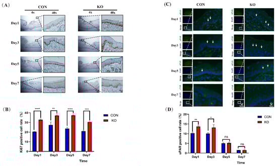 To determine the mechanism underlying the accelerated wound healing in Med1epi−/− mice, we next compared the proliferation of keratinocytes by Ki67 immunostaining of the wound mucosa. Ki67 is a nuclear antigen associated with cell proliferation and is present throughout the cell cycle. Therefore, immunostaining with Ki67 monoclonal antibody is an effective method to evaluate cell growth fraction [33]. The results showed that the number of Ki67-positive keratinocytes in Med1epi−/− mice was higher than that in the control mice on days 1, 3, 5, and 7 after wound construction (Figure 3A,B), indicating a higher proliferation rate of keratinocytes in Med1epi−/− mice. Next, we performed the uPAR immunostaining of the mucosal wound to assess keratinocyte migration activity. uPAR is an important regulator of extracellular matrix proteolysis, cell-extracellular matrix interactions, and intercellular signaling [34]. uPAR can also promote cell motility, invasion, proliferation and survival. In particular, uPAR is expressed only in certain tissues, such as pregnancy tissue during embryo implantation and placental development [35], central nervous system after ischemia or trauma [36], and keratinocytes during epidermal wound healing [37]. Therefore, uPAR can generally be regarded as a marker of keratinocyte migration [38]. Our results showed that the number of uPAR-positive keratinocytes was higher on the day 1 and day 3 after trauma, and the proportion of uPAR-positive keratinocytes was higher in the MED1 ablation group as compared to the control group on days 1 and 3 (Figure 3C,D). These results indicated that keratinocyte migration was more active in the oral mucosa of mice in the early stage of wound repair, and MED1 knockdown promoted the migration of oral keratinocytes at this stage. The number of uPAR-positive keratinocytes was relatively low on day 5 and day 7 after trauma. Additionally, there was no significant difference between the MED1 ablation group and control group (Figure 3C,D). These results indicated that keratinocyte migration was relatively less in the late stage of wound repair, which was consistent with the migration pattern of keratinocyte during wound repair [39].