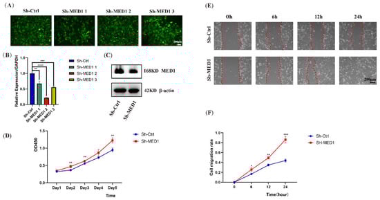 As further validation of in vivo results, we established the MED1-knockdown human oral keratinocyte (HOK) in vitro using lentivirus transfection technology. Three RNAi sequences targeting for MED1 were designed with the Invitrogen RNAi Designer. MED1 shRNA lentiviral vectors (Sh-MED1-1, Sh-MED1-2 and Sh-MED1-3) were created by inserting the sequence targeting MED1 into the GV493 lentiviral vector. GFP was detected by fluorescence microscopy (Figure 4A). After the knockdown, the level of MED1 gene expression was decreased significantly as indicated by qRT-PCR (Figure 4B). The Sh-MED1-2 group showed the highest transfection efficiency and was therefore selected for further experiments. Western blot demonstrated that MED1 protein expression was also significantly downregulated in this group (Figure 4C). To evaluate the effect of MED1 knockdown on cell proliferation activity, a CCK-8 assay was performed. The results revealed that MED1 knockdown markedly promoted HOK proliferation (Figure 4D). Next, a scratch wound assay demonstrated that MED1-knockdown HOK exhibited higher migration ability compared with the control group (Figure 4E,F).