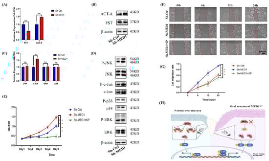 Activin-A/follistatin system is changed and the JNK/c-Jun pathway is activated in MED1 knockdown keratinocytes. (A) Relative expression of mRNA encoding for FST and ACT-A following transfection in HOK, (B) Relative expression of protein for FST and ACT-A following transfection in HOK, (C) Relative mRNA expression of JNK, c-Jun, ERK and p38, (D) Western blot assays for c-Jun, P-c-Jun, JNK, P-JNK, ERK, P-ERK, p38 and P-p38 in HOK after transfection, (E) The results of CCK-8 assay for sh-MED1 cells following the addition of SP600125, (F) The results of scratch wound assays for sh-MED1 cells following the addition of SP600125, and (G) Quantitative analysis of migrated cells, (H) Proposed model of accelerated oral mucosal wound healing in Med1epi−/− mice. Scale bar = 200 μm. Bars = means ± SD. ns means nonsignificant, * p < 0.05, ** p < 0.01, *** p < 0.001, **** p < 0.0001.