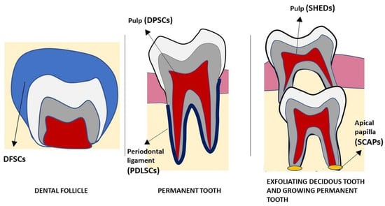 - Liu, J.; Yu, F.; Sun, Y.; Jiang, B.; Zhang, W.; Yang, J.; Xu, G.T.; Liang, A.; Liu, S. Concise reviews: Characteristics and potential applications of human dental tissue-derived mesenchymal stem cells. Stem Cells 2015, 33, 627–638. [Google Scholar] [CrossRef] [PubMed]